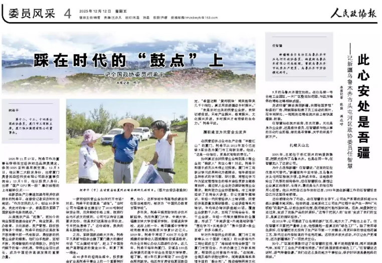 【人民政協(xié)報(bào)】2025年12月12日,人民政協(xié)報(bào)專訪柯希平文章《踩在時(shí)代的“鼓點(diǎn)”上》,刊登于第4版“委員風(fēng)采”欄目,照寧記者手記《致敬民營企業(yè)家,致敬奮斗者》同步刊登??孪F剑旱谑⑹?、十四屆全國政協(xié)委員,廈門市工商聯(lián)主席,廈門恒興集團(tuán)有限公司董事長。2025年11月27日,柯希平作為董事長帶領(lǐng)低空經(jīng)濟(jì)知名品牌奧捷龍,參加2025亞洲通用航空展;12月3日,他以第二大股東身份,出席廈門奧普拓自控科技有限公司股東董事交流會;12月5日,他以投資人身份,出席“國產(chǎn)GPU第一股”摩爾線程的上市敲鐘儀式……在新質(zhì)生產(chǎn)力賽道加速布局并收獲頗豐的柯希平,在接受記者采訪時(shí)樸實(shí)地說:“作為農(nóng)民的兒子,創(chuàng)業(yè)30多年來,我走對的每一步,都是因?yàn)榫o跟了國家經(jīng)濟(jì)命脈的跳動?!睆募缣艮r(nóng)產(chǎn)品“趕集”,到如今的商業(yè)版圖涵蓋冶金礦產(chǎn)、商業(yè)貿(mào)易、民辦教育、文化旅游、資產(chǎn)管理、股權(quán)投資等多個領(lǐng)域,柯希平的經(jīng)歷正是改革開